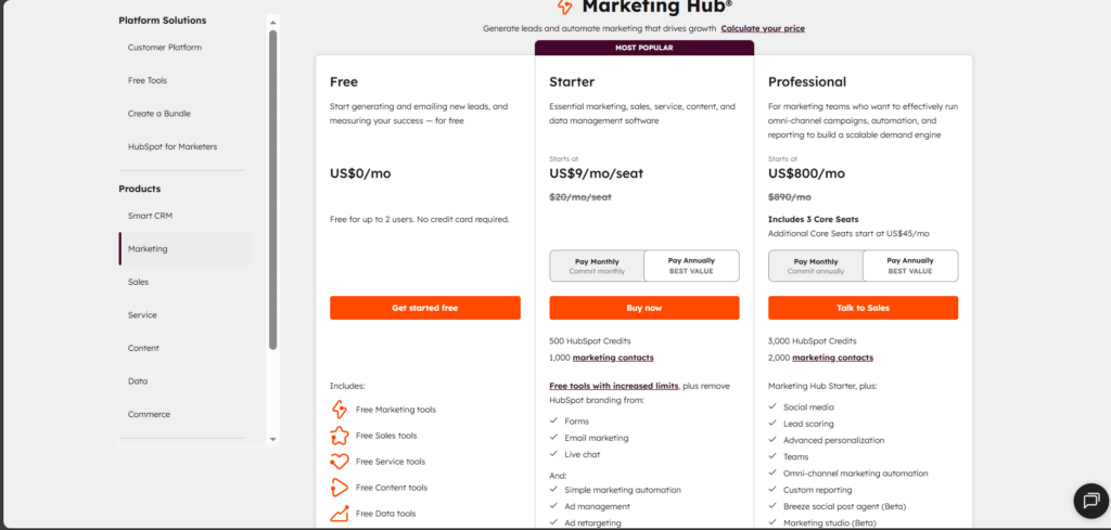 As you grow, HubSpot charges by feature tiers and the number of marketing contacts. Costs can rise quickly as you add advanced automation, workflows, AI tools, and premium CMS features. Still, HubSpot remains easier to budget for because its pricing model is straightforward and all-in-one.